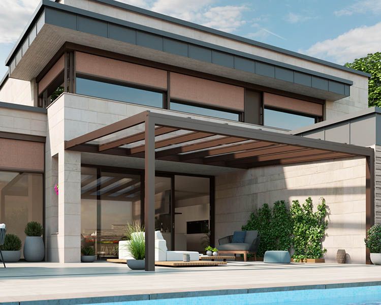 Das schräge Glasdachsystem ist auf das Wesentliche reduziert. Seine Sparren sind sehr schmal gehalten, damit der Blick in die Weite frei bleibt. Das durchdachte Baukastensystem ermöglicht eine nachträgliche Erweiterung mit Beschattungen, Verglasungen, LED-Beleuchtung und ist modular erweiterbar. So lässt sich das System jederzeit auf individuelle Wünsche oder örtlichen Veränderungen anpassen. Wasserabläufe und Stromzufuhr für Beschattungen sind nicht sichtbar in das schlichte Design integriert.